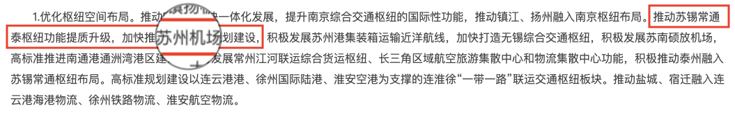 推动苏锡常通泰枢纽功能提质升级, 加快推进苏州机场规划建设 ,积极发展苏州港集装箱运输近洋航线
