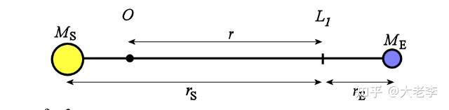 计算第一拉格朗日点。我们的目标是找到一个位置,使得太阳对航天器的合引力,减去地球对航天器的引力,恰好可以使航天器围绕太阳公转的周期为一年。下图中, M_s 是太阳质量, M_E 是地球质量,O点是地日合质心, L_1 是所求的第一拉格朗日点。