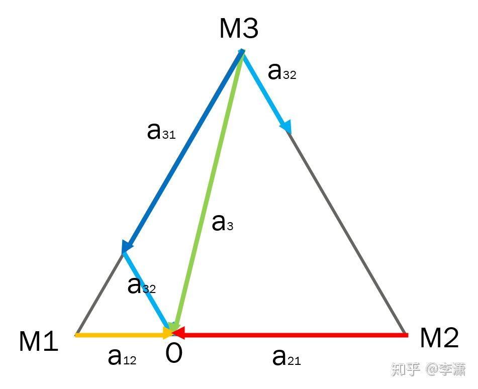 如图,三个天体质量分别为M1>M2>>M3,受到的引力加速度正比于天体质量,由M3、M1到M2的距离相等关系可知a12=a32,a3会指向质量中心O,而a12、a21、a3的大小正比于OM1、OM2、OM3,即天体所受的向心加速度正比于到质量中心的距离,由匀速圆周运动向心加速度与角速度的关系可知,三个天体绕质量中心公转角速度相等。