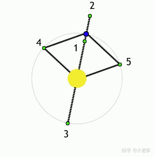 最后是L4和L5,这两个点不再恒星和行星的连线上,而是与恒星和行星呈等边三角形,这个位置上所受的合力方向刚好指向了恒星和行星的质量中心,而且合力大小刚刚好,公转角速度与行星公转角速度相等,于是这两点也相对恒星和行星静止了。