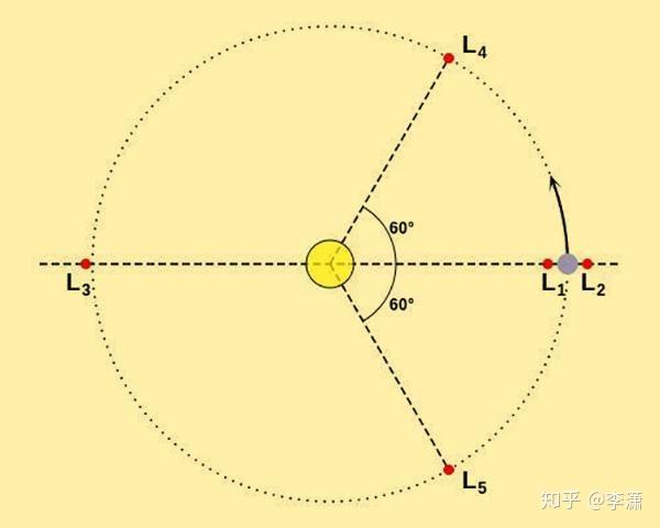 而前面说了,地球和太阳的合质心,其实并不是太阳中心,而是稍微偏向地球这一边的。那么如果之前那个合力恰好指向地球和太阳的合质心,并且能使整个质点获得与地球同样的角速度,那么这位置就是另一个拉格朗日点。具体计算我也不说了,但拉格朗日证明了这个位置就应该是处于能与地球、太阳构成正是正三角形的位置上,从而增加了两个拉格朗日点,称为第四和第五拉格朗日点,简称L4和L5点。