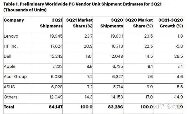 因此联想的口碑与销量也节节攀升,根据市场机构Gartner发布的2021 Q3 PC市场销量统计,联想以1995万台的出货量,拿下23.7%的份额,稳居全球第一