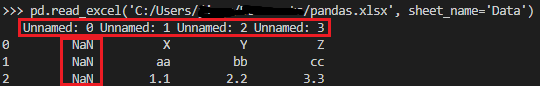 此时,我们再来看读取到的DataFrame,出现了很多不明字段。这是因为read_excel的默认读取范围从工作表左上角(A1单元格)到数据表的最末行和最末列。由于第一行没有数据,列标题被默认显示为Unnamed:x。第一列也没有数据,所以显示NaN(Not a Number)。 这里要注意的是,DataFrame的行或列索引序号都是从0开始的,即第0行为起始行,第0列为起始列。