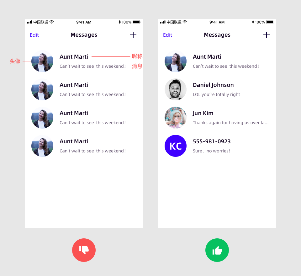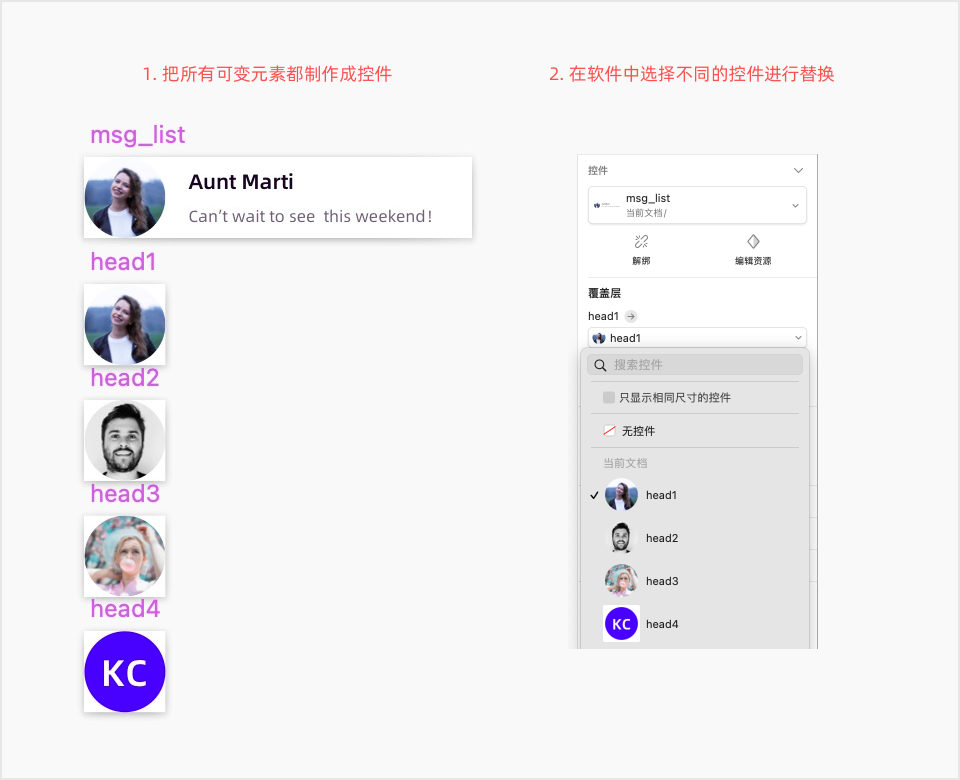 如果我们使用 Sketch 来制作这种“内容差异”和“样式一致性”共存的元件( Sketch 中叫“控件")时,操作过程会比较繁琐,首先需要把列表中的所有头像都制作成单独的元件,然后分别去选择替换。