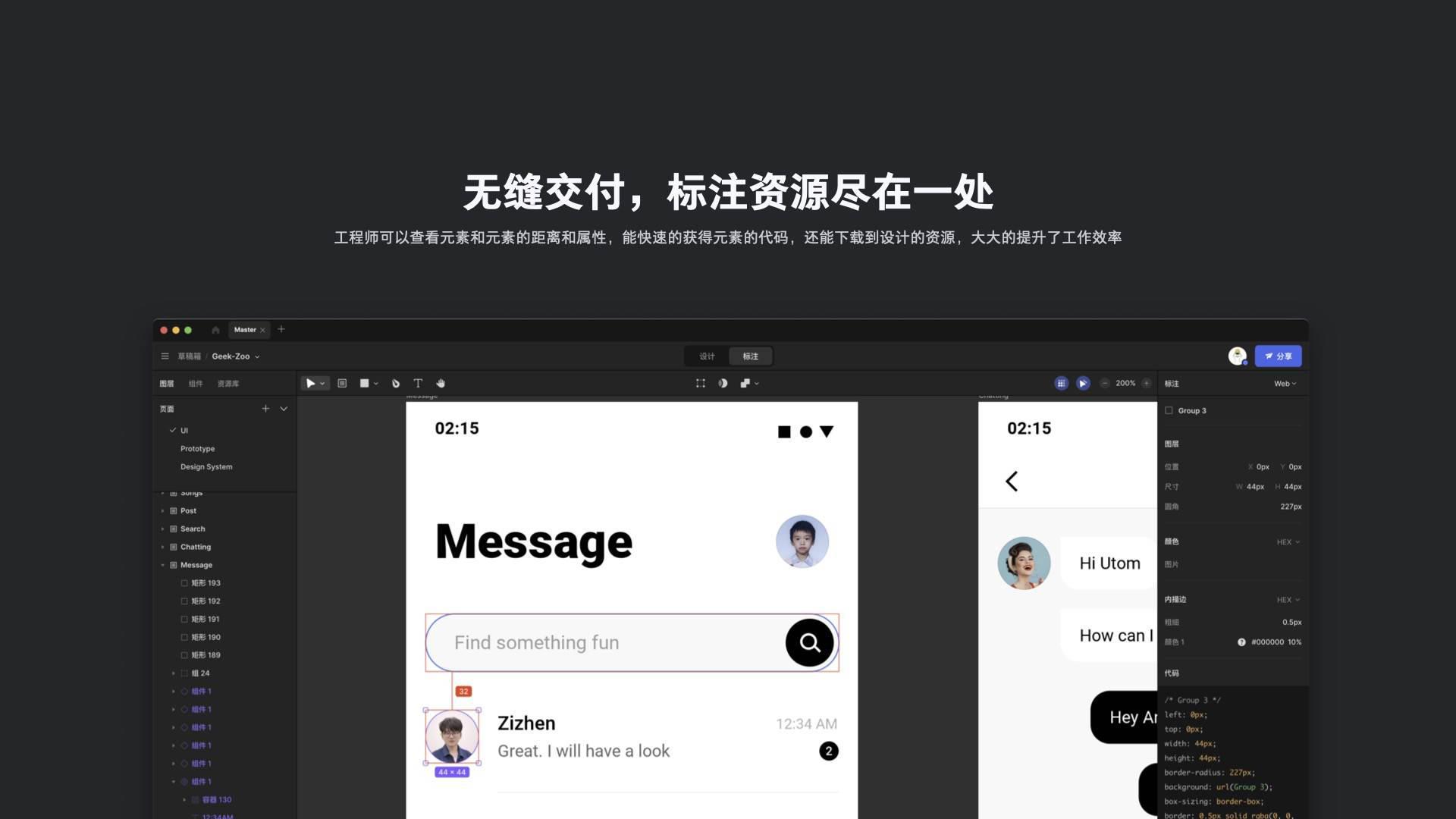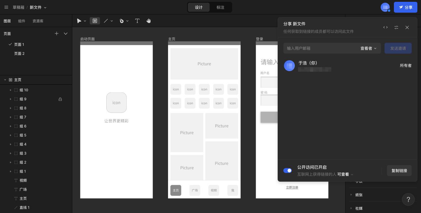 MasterGo 的云端协作能力很强,产品经理、设计师和工程师等各种角色可以在同一个文件中进行操作。一个设计稿的分享方式,和平时我们在各种文档、电子表格中的分享是一样的,可以生成一个链接发送给相关角色完成共同编辑,非常简单。