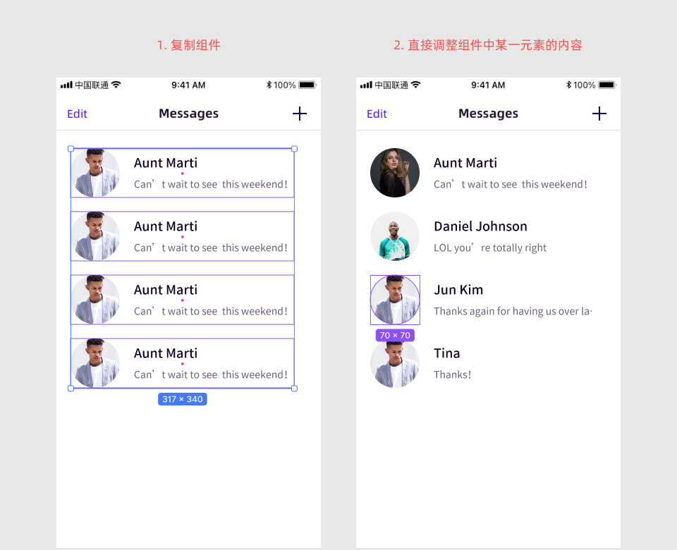 但是在实际工作中,同一元件中的内容又会存在一定差异。例如,我们在设计“消息列表”页面时,为了让设计效果贴合真实使用场景,头像尺寸、昵称和消息文字的颜色、字号需要保持一致,但头像的图片、昵称、消息等元素的具体内容又都会存在差异。