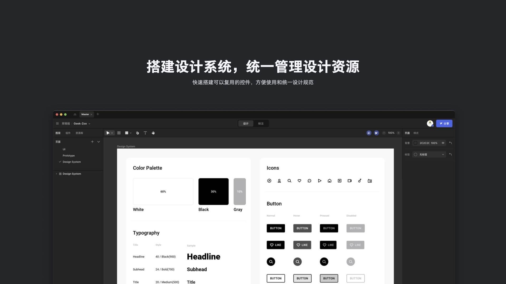 MasterGo 还有一个重要作用,可以帮助产品经理、设计师和前端工程师把一款产品所有的元素和样式集合在一起,建立一个可以随时访问的 UI 规范文件。当工程师或者产品经理需要查找某一个控件的视觉规范,或者查找某一文字样式,都可以随时访问同一个链接。这样能够集中管理设计资源,对于团队协作非常有帮助。