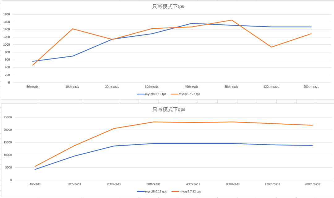 测试mysql5.7和mysql8.0 分别在读写、只读、只写模式下不同并发时的性能(tps,qps)