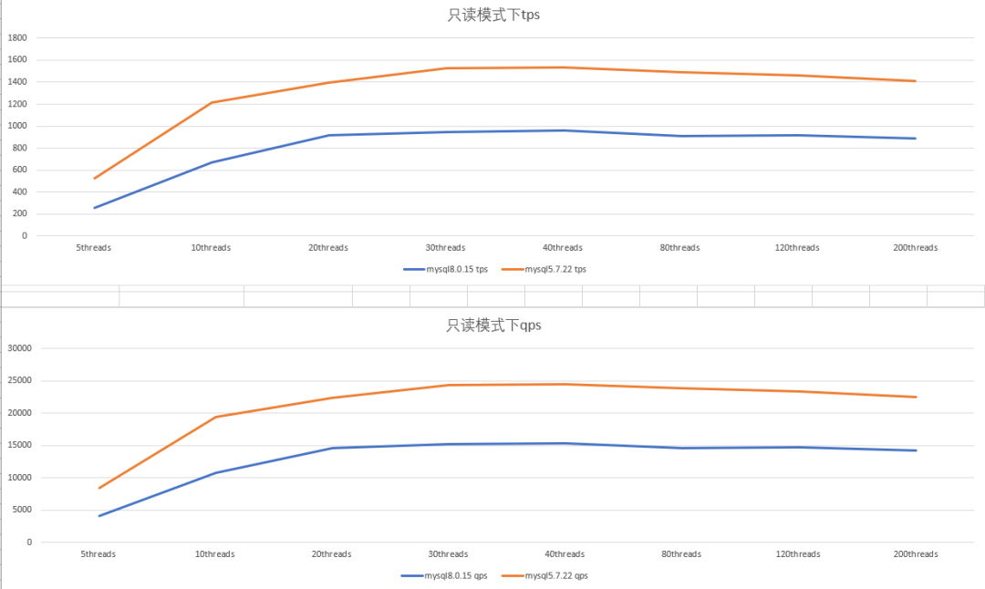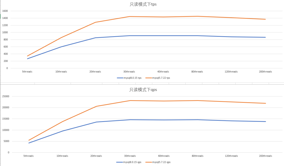 0 2配置,只读模式下,mysql5.7.22性能比mysql8.0.15 好1/3左右;随着并发数的上升,性能也没有上升,反而有下降的趋势