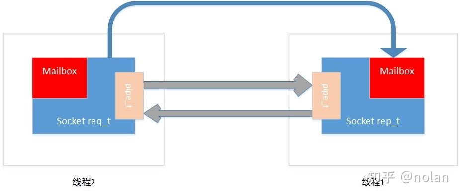 这是啥?其实就是线程之间通过两个队列来交互,对于每个线程来说都是通过其中一个队列发消息给对方,从另一个队列中读取对方发送的消息。这两个队列根据源码用的名称,我称之为pipe,后面会反复提到。zmq所做的就是把pipe绑定到对应的线程上,然后在send和recv的时候通过pipe来发出、获取信息。是的,就是这么简单~