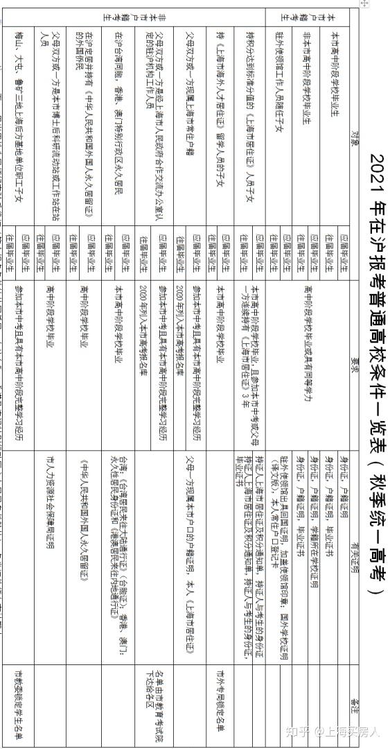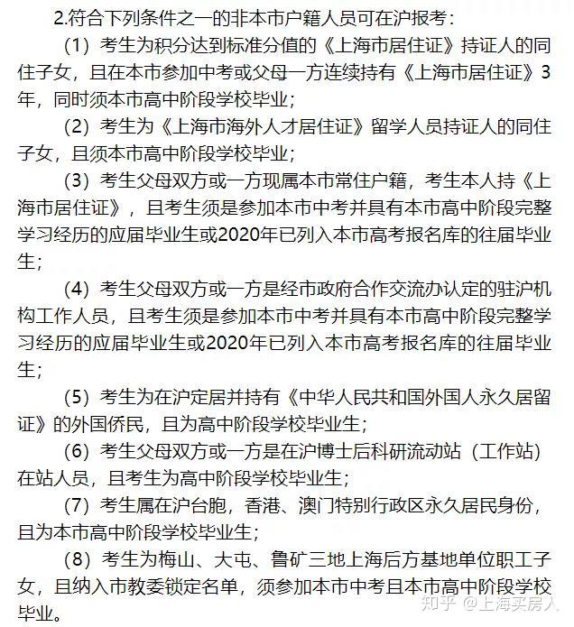 10月22日,上海市教委发布了 《上海市教育委员会关于做好2021年上海市普通高校考试招生报名工作的通知》 ,通知中明确了2021年可以在上海参加高考的 8类非沪籍考生的条件 。