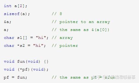 另外还有两个重要的隐式类型转换必须弄清楚,就是 数组名和函数名 。数组名即表示整个数组,但在除sizeof、_Alignof和&作用下,数组名自动转换为首元素的指针。字符串常量在以上3种情况和用作为数组初始化之外,也自动转换为首元素的指针。函数名是函数类型,在除sizeof、_Alignof和&作用下,函数名自动转换为相应函数类型的指针。