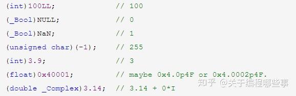 除了显式的强制转换外,还会发生一些隐式的转换,尤其常见于代数运算中。 整型提升 (integer promotion)将小整型提升为int或unsigned int,若int包含该小整型则转为int,否则转为unsigned int。整型提升仅发生于前置+-、~和移位的所有操作数,以及switch语句和常用代数转换中。 常用代数转换 (usual arithmatic conversion)发生在比较、算术(+-*/%)和位(&|^)运算中,它将两个操作数转换为相同的类型: