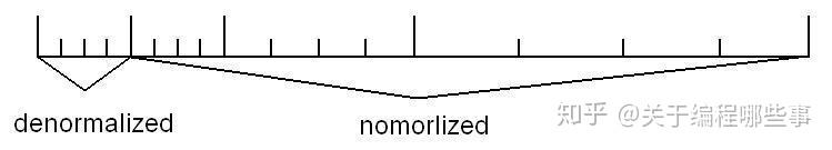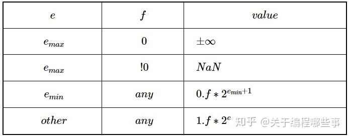 符号位是整个浮点数的符号,所以会存在正负0和正负无穷。指数被解释为无符号整数,并减去一个偏差(bias)。偏差值会导致emaxemax比eminemin绝对值大1(考虑到倒数的溢出),比如float类型的偏差为127,emaxemax = 128,eminemin = -127。指数取最大值时,若尾数为0,整个数解释为正负无穷大,否则为NaN(not a number)。指数为最小值时,尾数解释为0.f0.f(denormalized),否则解释为1.f1.f(normalized)。