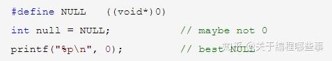 空指针 是一个特殊的指针常量,它不等于任何有意义的地址,它无法直接表示。常量0在特定语境下表示空指针,但最终的编译结果未必是0。NULL大部分时候指空指针,宏NULL一定要定义成对0的强制转换,以避免0的多义性。