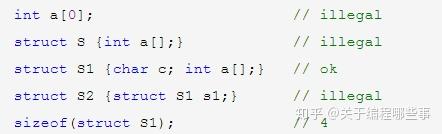 数组 由多个相同类型的成员组成,它们在内存中连续分布,可以通过index获取。C中没有多维数组的概念,只有数组的数组,仅此而已。数组的长度不能为0,新规范支持结构末尾的可变数组a[](flexible array member),它相当于预定了一个数组的位置,而不一定有成员。含可变数组的结构至少还有另外一个成员,且它不可以再做组合类型的成员。由于align的作用,可变数组与结构最后一个成员之间可能有空隙,该结构的sizeof结果包含该空隙。