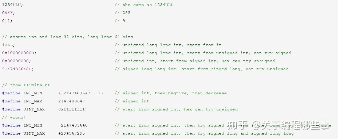 int型常量 以非0数字开头则表示10进制数,0x或0X开头表示16进制数,0开头表示8进制数。后面可以有后缀U、L或LL(不限大小写),分别表示unsigned、long和long long。U可以和L或LL组合,且顺序随意。int型可以按它能表示的最大数来排序,如果能表示的最大数相同,则按int、long、long long排序。一个可能的队列为int、long、unsigned int、unsigned long、long long、unsigned long long。int型常量的类型以后缀类型(默认为int)为起点,从队列中寻找第一个满足规则且能包含其值的类型。规则是:(1)如果起点为unsigned,则尝试signed;(2)如果起点为signed且为10进制数,则不尝试unsigned。另外要注意,不存在负常量,它只是对正常量的负运算。
