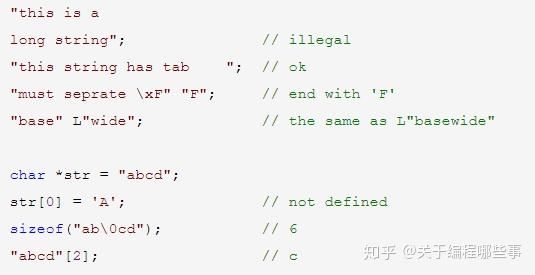 字符串 是一类特殊的数组,它的成员是字符型。字符串常量定义在一对双引号中,其中可以是字符或转义序列,也可以有L、u或U作前缀。字符串常量中不能换行,但可以有空格或tab。连续的字符串常量(中间可有空白)在预处理时会被拼接为一个,该特点便于书写长字符串和分开转义序列与普通字符,单字节字符串和宽字节字符串拼接的结果为宽字符。字符串常量(拼接后)末尾有一个隐式的字符'\0',字符串函数把它当做结束符。任何字符串常量(包括初始化字符串)都会存储在常量区,编译器可以选择合并相同的字符串常量。字符串常量可以直接当数组使用,但对其修改是未定义的。