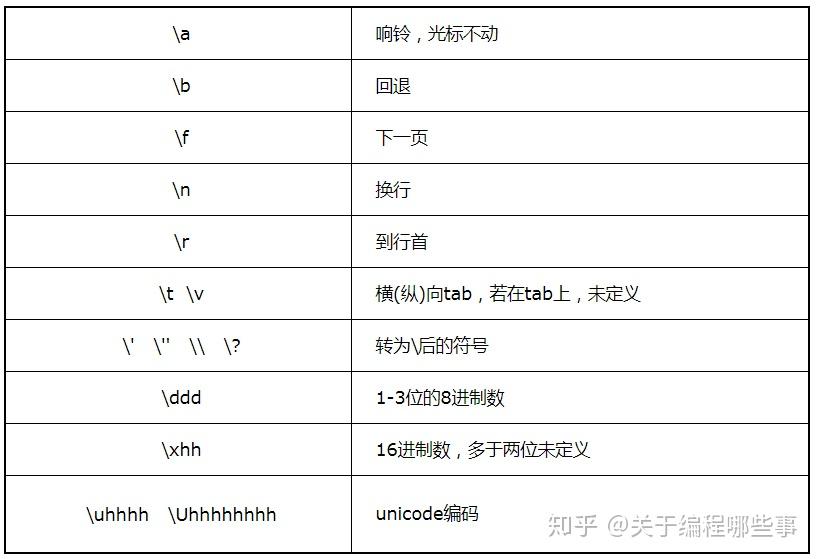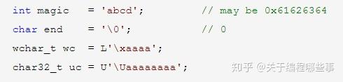 字符型 包含 char 、wchar_t、char16_t和char32_t,其中char是基本类型,其它为int(带说明符)的宏定义。char类型永远是1个byte,可表示basic字符集,它的符号是基于实现的。字符常量用一对单引号表示,引号里为字符或转义序列,引号前有可选前缀L、u和U(分别对应后3种字符型)。字符常量本身的类型为int或unsigned int,它的值为引号中字符的编码或转义序列的值。引号中可以有多个字符,但它们在int中的存储位置是不定义的。下表中列出了转义序列及其含义: