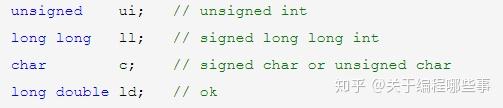 类型前可以有多种修饰符,它们有不同种类和用途,这里先介绍一类叫类型说明符(非规范定义)。包括short、long、long long(新规范)、signed和unsigned,它们仅作用于基本型,且长度和符号可以组合使用。所有的说明符都可以修饰int,int默认为signed(可不写),有说明符时int可不写。signed、unsigned可修饰char,long可修饰double,其它用法皆非法。