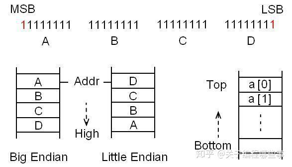 一个数据由多个bit组成,按照二进制的表示习惯,将最左侧的bit叫做 MSB (Most Significant Bit),最右侧的bit叫做 LSB (Least Significant Bit),这里的significant当然是指该bit表示的数量级。这些bit会划分到连续的byte中,存储时byte的顺序基于系统或平台。这又引出了 大小端 (Endian)的概念,LSB存储在高地址时叫Big Endian,否则叫Little Endian。但无论如何,该数据的地址都是指最低地址。而且进一步讲,数组和结构成员的地址也是按它们的指数或定义顺序向高地址增长的,即使在栈里也不例外(栈底一般在高地址,栈顶向低地址增长)。