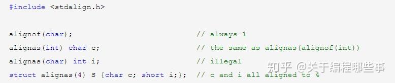 新规范中引入了关键字 _Alignof 和 _Alignas (同sizeof一样不是函数),新引入的关键字一般以'_'和大写字母开头(为了不和编译器的扩展或用户自定义冲突),如果想用小写字母开头的,需要include对应的标准库(宏定义)。_Alignof后跟类型,得到类型的对齐单位。_Alignas后跟类型或整数常量,用来修饰类型或变量定义,但它不能小于其原有的对齐单位。
