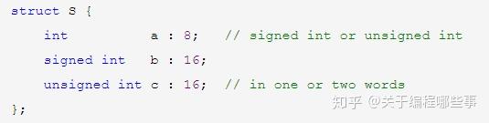 结构 体中可以包含不同类型的成员,由它可以组成更复杂的抽象类型。如果从面向对象的角度说,对象的属性体现在结构的普通成员上,对象之间的关系则体现在结构的指针成员上。结构中还可以定义位域(bit field),位域是指定长度的整型,它被放置在word中。空间足够时,相邻位域紧靠之前的位域,否则未定义。未做显式说明时,int位域的符号基于实现。对位域的操作效率比普通整型低,它往往用于紧凑空间或一致性需求(传输协议)。