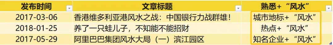 具体套用可以出现很多不一样但又好用的结果,如: 城市地标+“风水”、热点+“风水”、知名企业+“风水”…… 翻看这几篇的阅读量,均是 10W+。