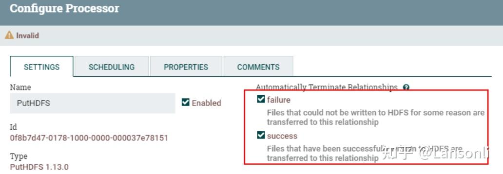 配置“PutHDFS”处理器“failure”和“success”的FlowFile传递关系为自动终止: