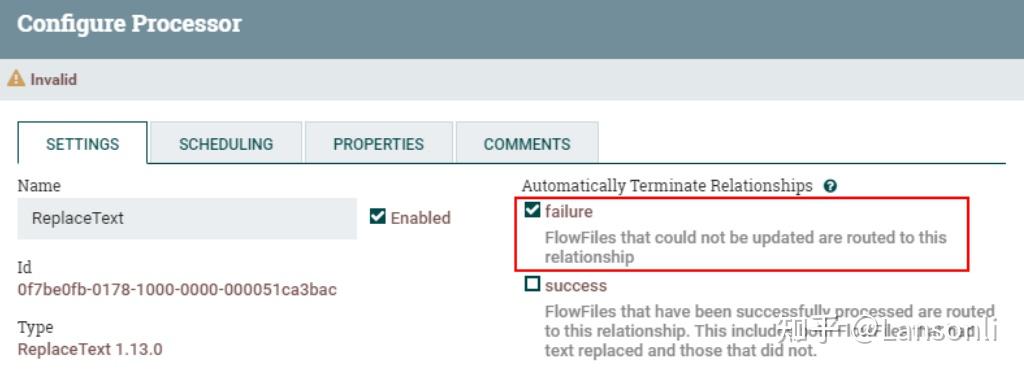 配置“ReplaceText”处理器“failure”的FlowFile传递关系为自动终止:
