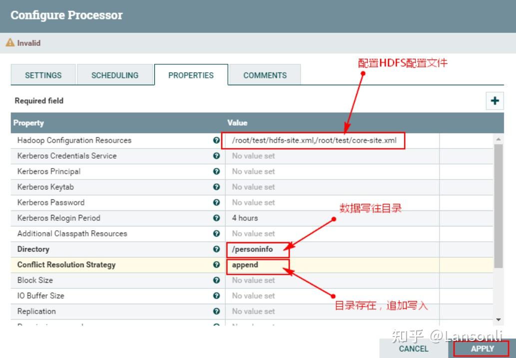 这里创建“PutHDFS”处理器将上游处理的数据写入HDFS目录中。配置步骤如下: