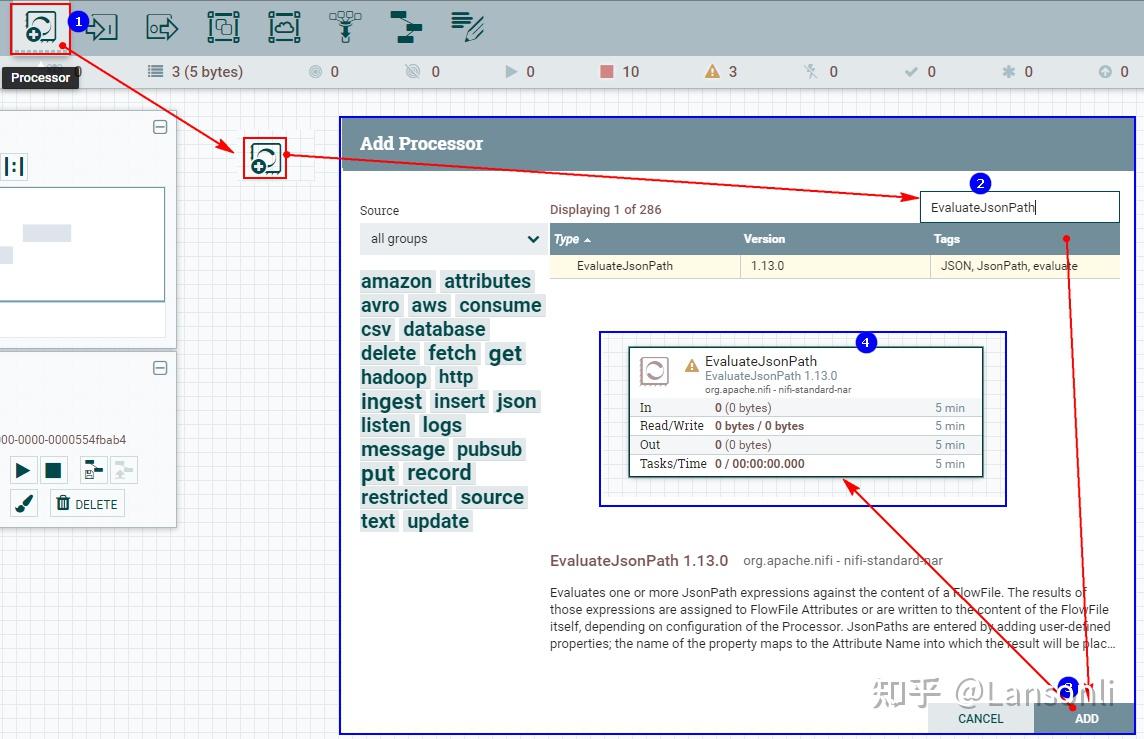 “EvaluateJsonPath”处理器根据FlowFile的内容计算一个或多个JsonPath表达式。根据处理器的配置,这些表达式的结果被赋值给FlowFile属性,或者被写入FlowFile本身的内容。