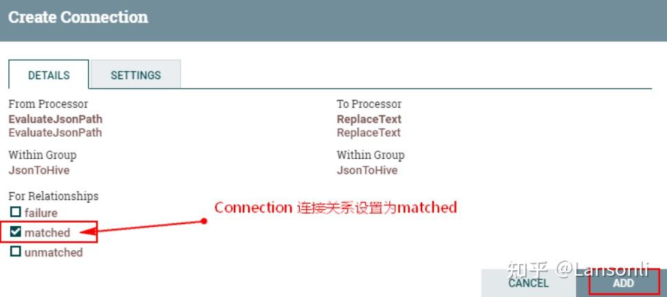 2、连接“EvaluateJsonPath”处理器与“ReplaceText”处理器,同时设置