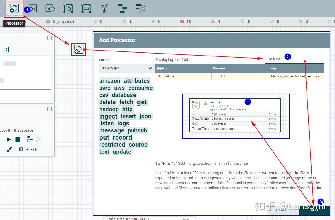 “TailFile”处理器作用是"Tails"一个文件或文件列表,在文件写入文件时从文件中摄取数据。监控的文件为文本格式,当写入新行时会接收数据。如果要Tail的文件是定期"rolled over(滚动)"的(日志文件通常是这样),则可以使用可选的"Rolling Filename Pattern"从已滚动的文件中检索数据,NiFi未运行时产生的滚动文件在NiFi重启后仍会监控到。建议将运行计划设置为几秒,不使用默认0秒运行,否则此处理器将消耗大量资源。此处理器不支持监控压缩的文件。