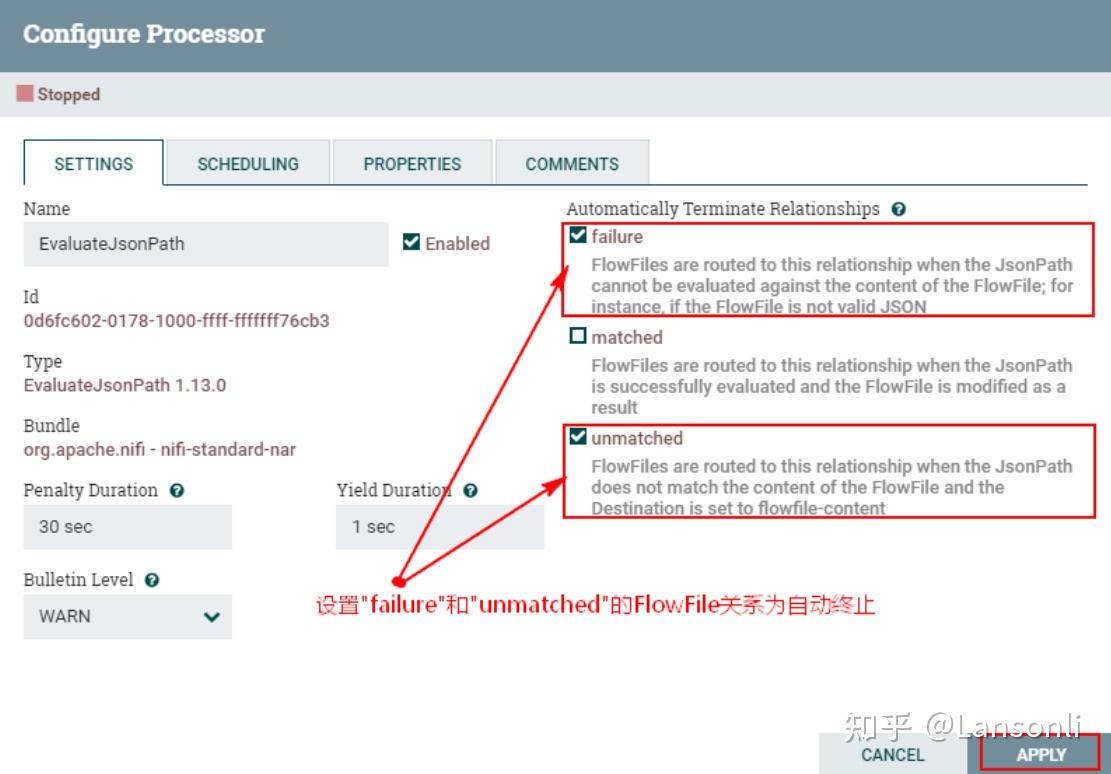 在“EvaluateJsonPath”中设置“failure”与“unmatched”的传递关系为自动终止: