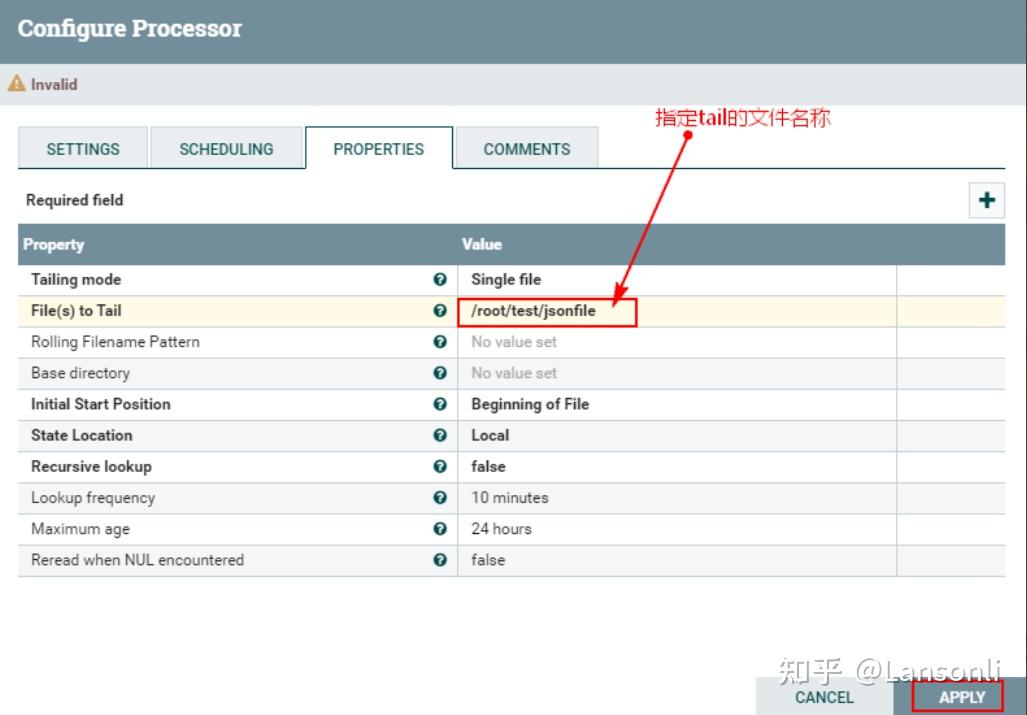 关于“TailFile”处理器的“Properties”配置的说明如下: