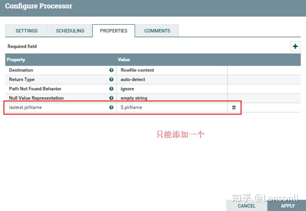 通过添加用户自定义的属性来输入Jsonpath,添加的属性的名称映射到输出流中的属性名称,属性的值必须是有效的JsonPath表达式(例如:$.name)。"auto-detect"的返回类型将根据配置的目标进行确定。当"Destination"被设置为"flowfile-attribute"时,将使用"scalar"(标量)的返回类型。当"Destination"被设置为"flowfile-content"时,将使用"JSON"返回类型。