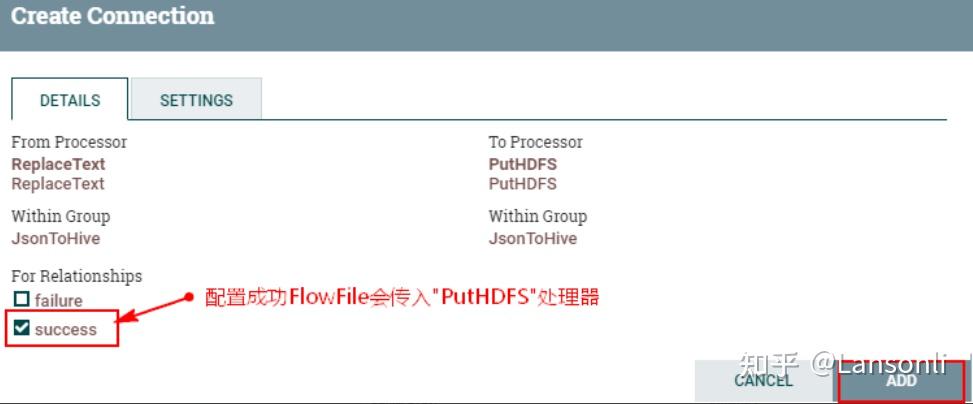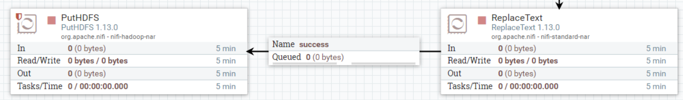 2、连接“ReplaceText”处理器与“PutHDFS”处理器并配置