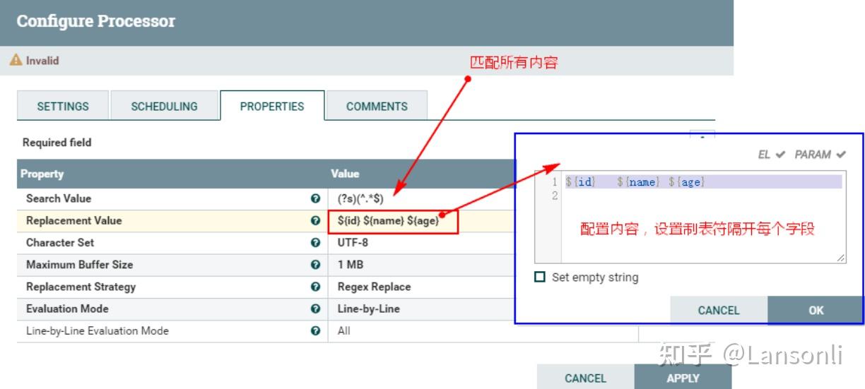 1、新建“ReplaceText”处理器,配置“PROPERTIES”处理器