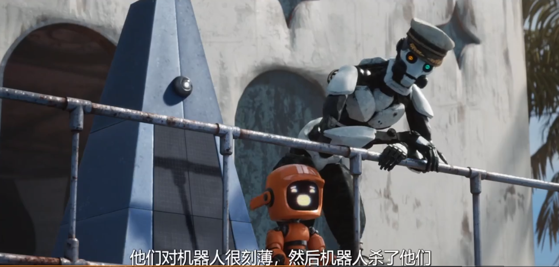 三个机器人虽然很话痨,但是它们的每句话都很有意思。首先就是人类造出恐怖的武器,拿来伤害自己同胞。这在他们机器人的视角里,一个种类,竟然会想尽一切办法来残杀同类,想想真是讽刺。自诩为高等文明,却让傲慢断送了自己,三个旁观机器人直接戳破人类的可悲之处。如果未来世界,真像影片里面那样,在我看来,人类也只不过是个“聪明”的低等生物罢了,却总以为自己很了不起。