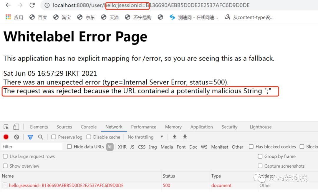 其实在Spring Security中,即便我们不做什么特别的配置,也不用担心会被会话固定攻击。这是因为Spring Security中自带的HTTP防火墙机制会帮助我们拦截不合法的URL,当我们视图访问带有sessionId的URL时,实际上会被重定向到类似于下图中: