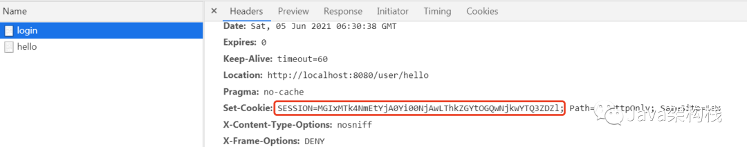 以 Spring Boot 为例,服务端生成 sessionid 之后,返回给前端的响应头是这样的: