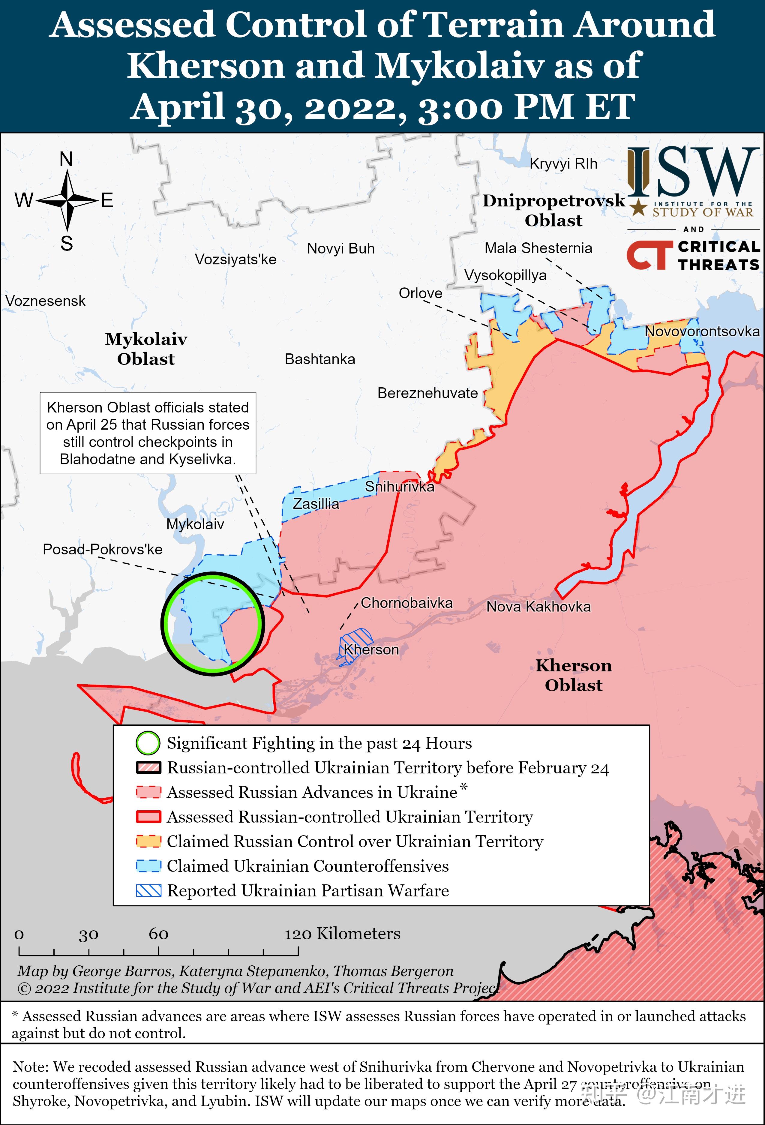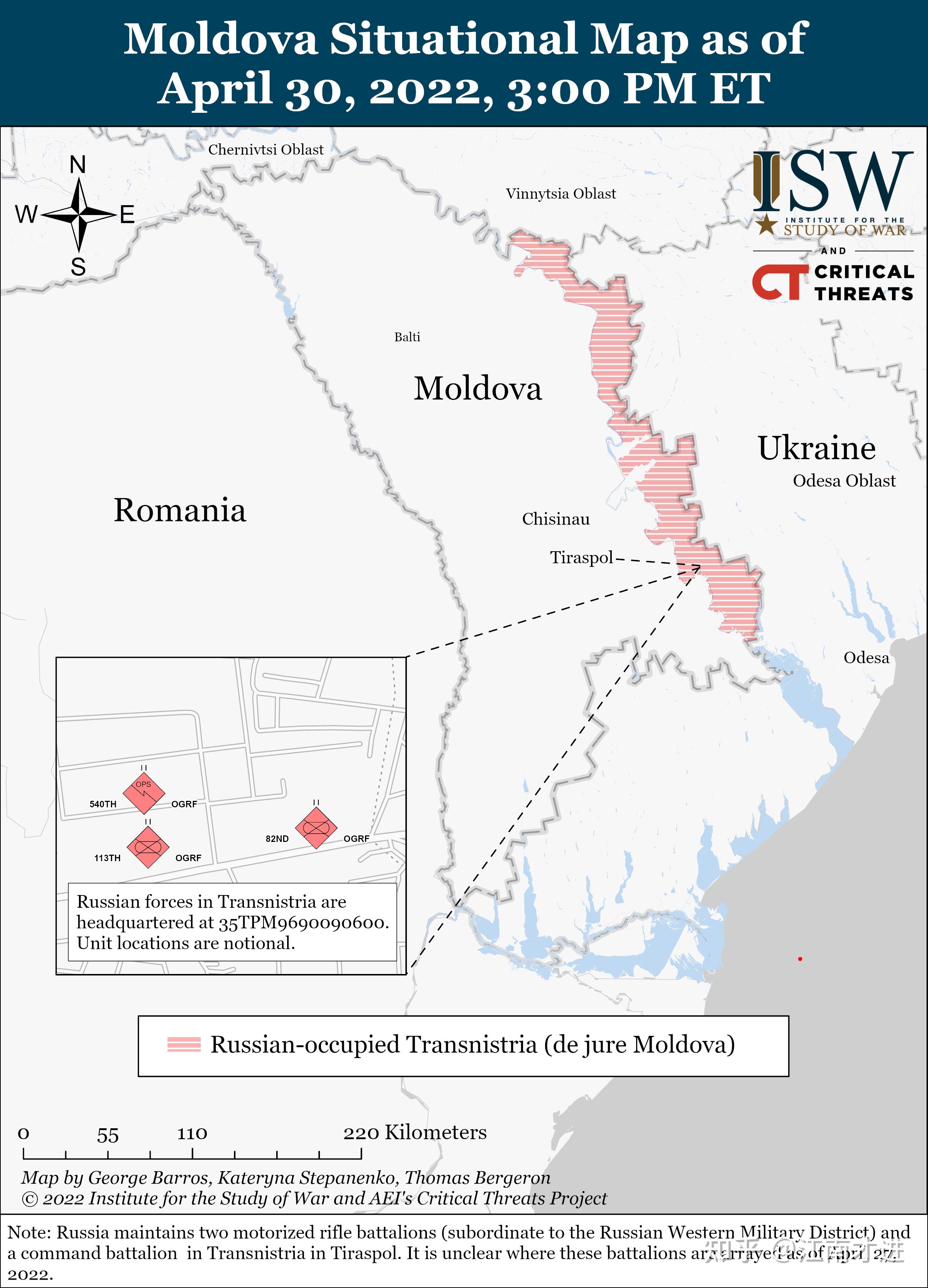 俄罗斯军队继续优先考虑改善他们的战术阵地和炮击乌克兰在南轴的阵地,但在 4 月 30 日没有取得任何确认的进展。 [15] 乌克兰总参谋部特别指出,第 8 和第 49 联合武装集团军、第 22 集团军的成员军团、黑海舰队和空降部队正在参与作战行动以改善他们的战术阵地(表明局部攻击以占领关键地形,而不是主要的进攻行动),并正在重新集结和补充补给,以准备重新推动到达行政区赫尔松州边界。 [16] 俄罗斯军队炮击了扎波罗热、第聂伯罗彼得罗夫斯克和尼古拉耶夫州的几个地点。 [17] 乌克兰总参谋部表示,俄罗斯军队继续散布有关乌克兰军队对德涅斯特河沿岸居民构成威胁的虚假信息。 [18]