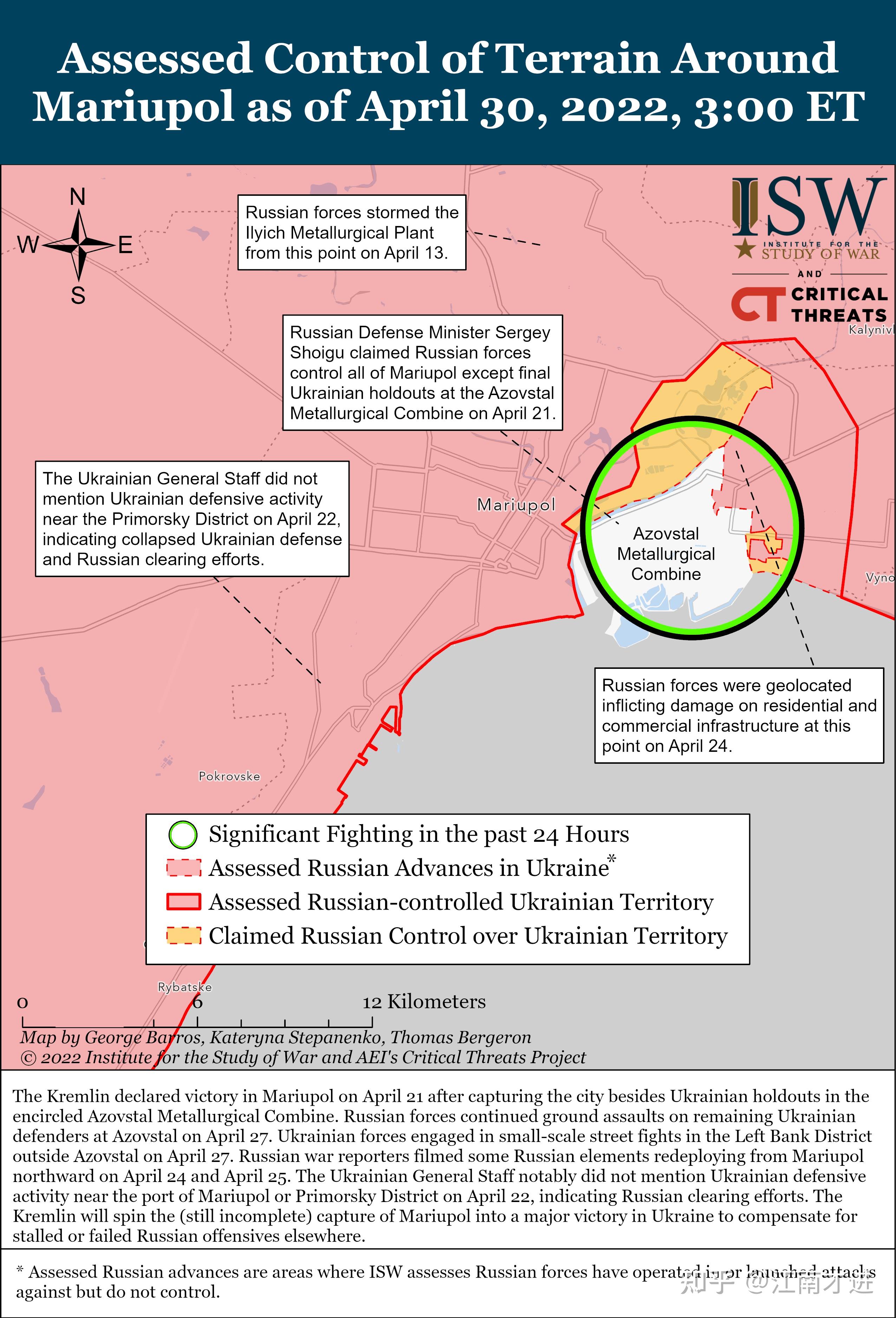 留在马里乌波尔的俄罗斯军队,包括第 810 海军步兵旅的成员,继续在亚速斯塔尔钢铁厂封锁乌克兰军队,并于 4 月 30 日进行了空袭。 [1] 占领俄罗斯军队正在通过马里乌波尔加强占领措施。Mariupol 市长的顾问 Petro Andryushchenko 表示,根据 DNR 颁发的许可证,正在重新安置 Mariupol Staryi Krym 地区的废弃房屋,一旦俄罗斯军队巩固了对马里乌波尔的控制权,克里姆林宫计划将先前被强行驱逐到俄罗斯的马里乌波尔居民遣返。城市。 [2] 自称顿涅茨克人民共和国(DNR)的丹尼斯·普希林(Denis Pushilin)于 4 月 30 日宣布了马里乌波尔的“伟大建设”。 [3] Pushilin 声称,一旦乌克兰在 Azovstal 的阵地得到“解决”,DNR 部队将在克里姆林宫的支持下重建马里乌波尔的基础设施。俄罗斯和 DNR 部队可能会推进重建和重新安置行动,以进一步巩固对马里乌波尔的行政控制,并推动克里姆林宫声称已经完全占领了这座城市。