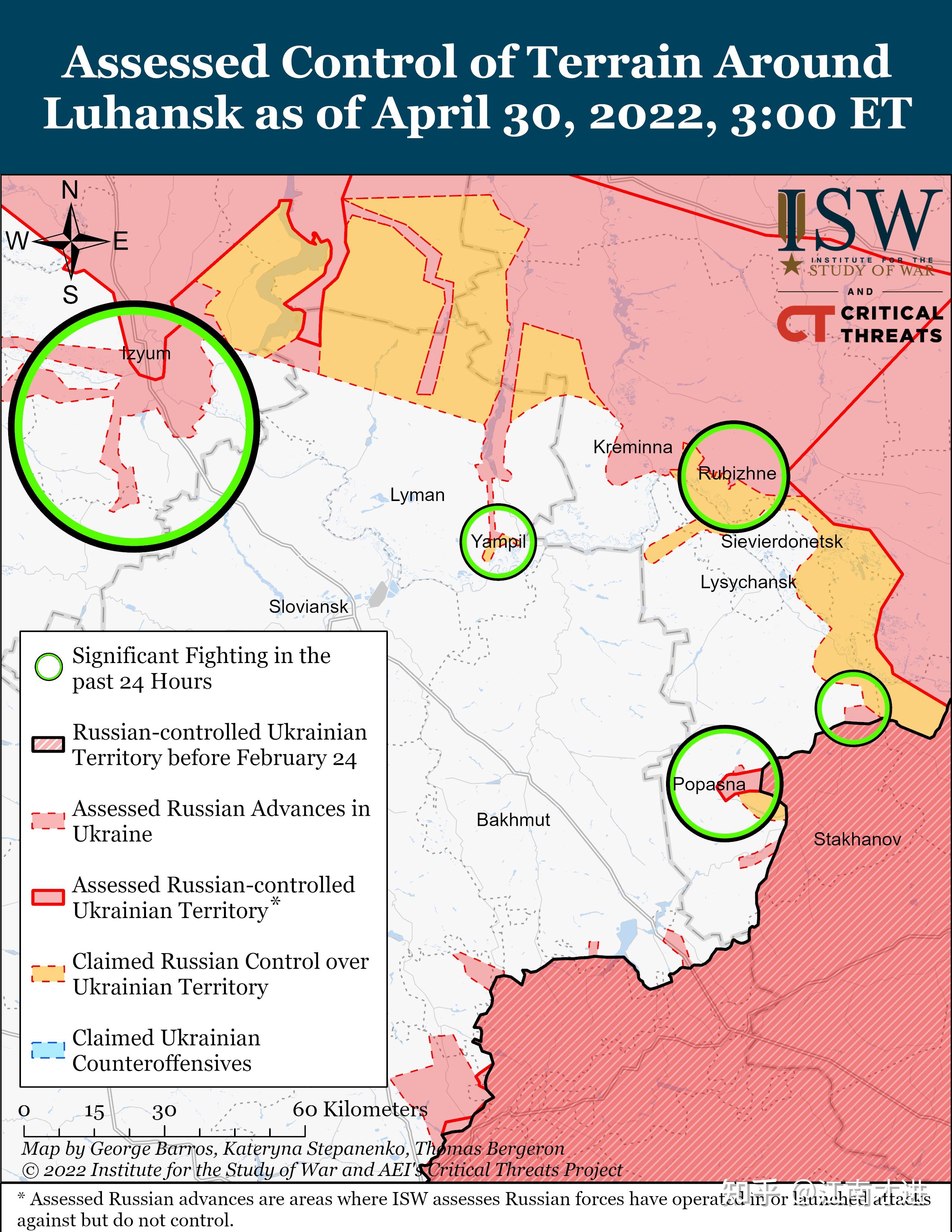- 俄罗斯军队从伊久姆向东南进攻,从克雷米纳和波帕斯纳向西,从顿涅茨克市向北进攻,可能会在对抗乌克兰守军时取得稳定但战术上的收益。