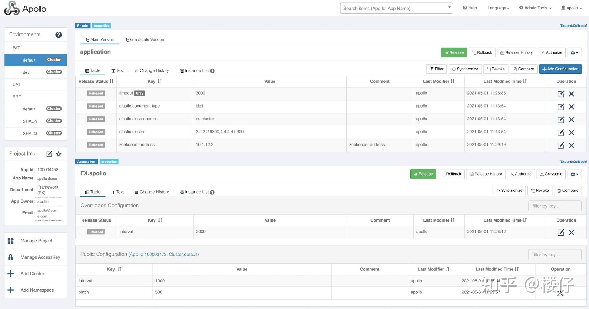 - Apollo自身提供了比较完善的统一配置管理界面,支持多环境、多数据中心配置管理、权限、流程治理等特性。