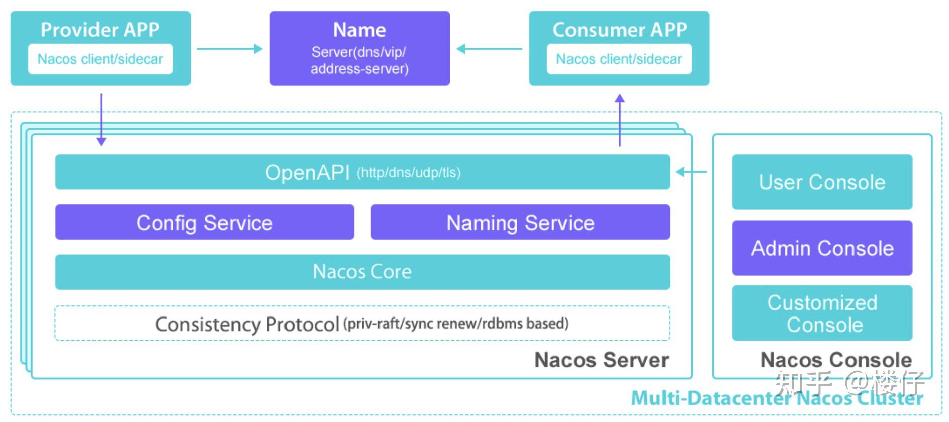 - Nacos 支持基于 DNS 和基于 RPC 的服务发现。服务提供者使用原生SDK、OpenAPI、或一个独立的Agent TODO注册 Service 后,服务消费者可以使用DNS TODO 或HTTP&API查找和发现服务。