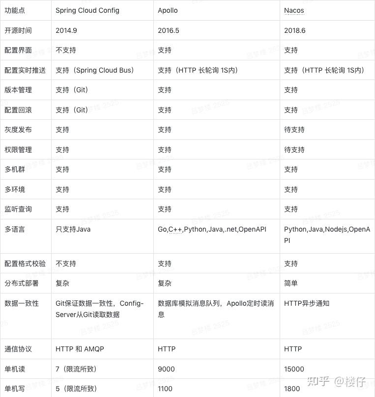 由于 Disconf 不再维护,下面对比一下 Spring Cloud Config、Apollo 和 Nacos。