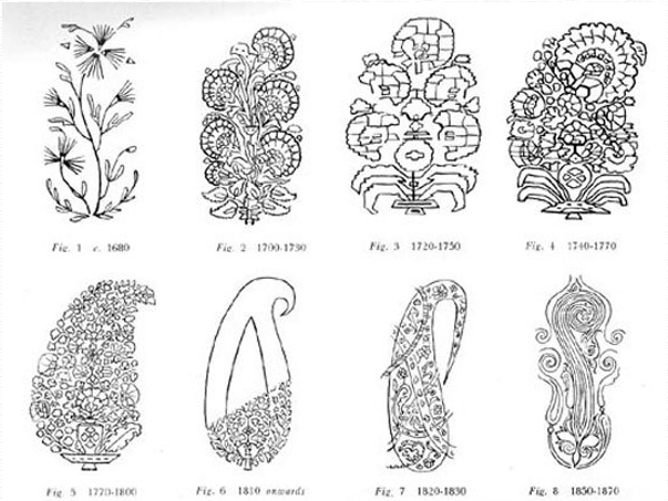 今天我们常见的佩斯利纹样,无论造型亦繁亦简,都脱离不开这些基本的形体,如: