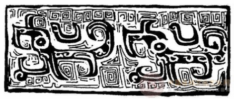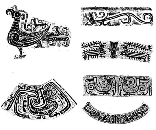 夔纹是一种和龙相似的纹路,这种纹路通常是侧面体现,或者是两个夔纹相对组成饕餮纹,或者是作为饕餮纹的附属装饰,就像上面那个图上的铜器。夔形象变化比较多,如两头夔纹,蕉叶夔纹,三角夔纹等等。在山海经中写,有兽状如牛,苍身而无角,一足,出入水则必风雨,其光如日月,其声如雷,其名曰夔。据说夔最后被黄帝做成大鼓,因为其声音大,用来鼓舞士气,才打败了蚩尤。